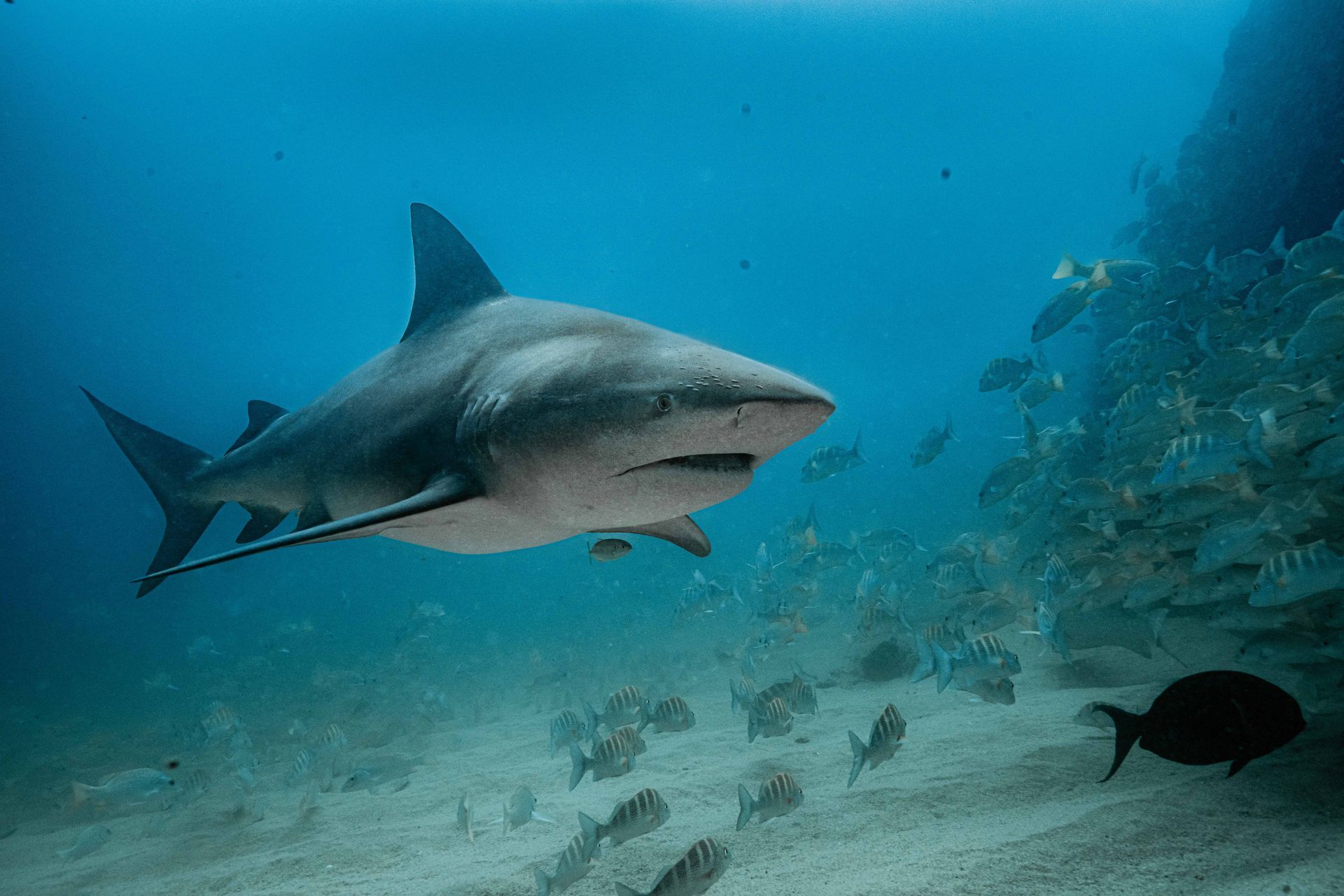 Bull Sharks: Cabo Pulmo is particularly famous for its bull shark encounters. These powerful predators are often seen patrolling the coral reefs, especially during the warmer months, where you can see up to 15 in one dive.